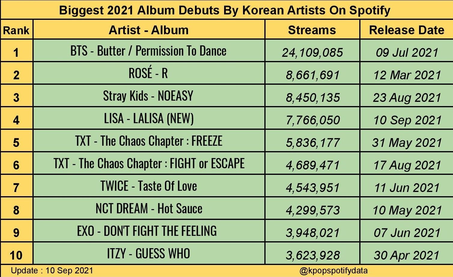 Spotify unveils BTS as this years most streamed K-Pop artist. About Press Copyright Contact us Creators Advertise Developers Terms Privacy Policy Safety How YouTube works Test new features Press Copyright Contact us Creators. The best song of 2021 Worldwide is drivers license by Olivia Rodrigo.